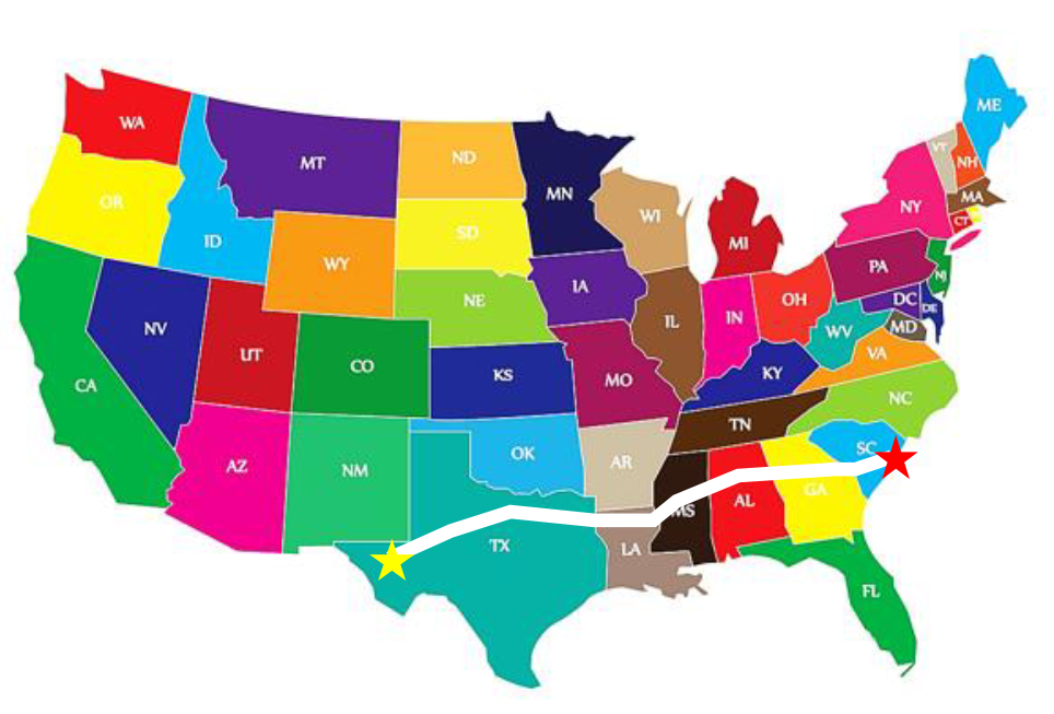 Texas – 636.08 miles Cities – Pecos, Monohans, Odessa, Midland, Big Spring, Colorado City, Sweetwater, Abilene, Fort Worth, Dallas, Longview, Marshall