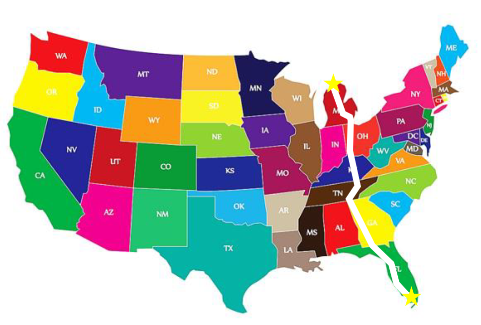 Florida – 382.15 miles Cities – Miami, Hollywood, Fort Lauderdale, Boca Raton, West Palm Beach, Fort Pierce, Melbourne, Titusville, Daytona Beach, Jacksonville